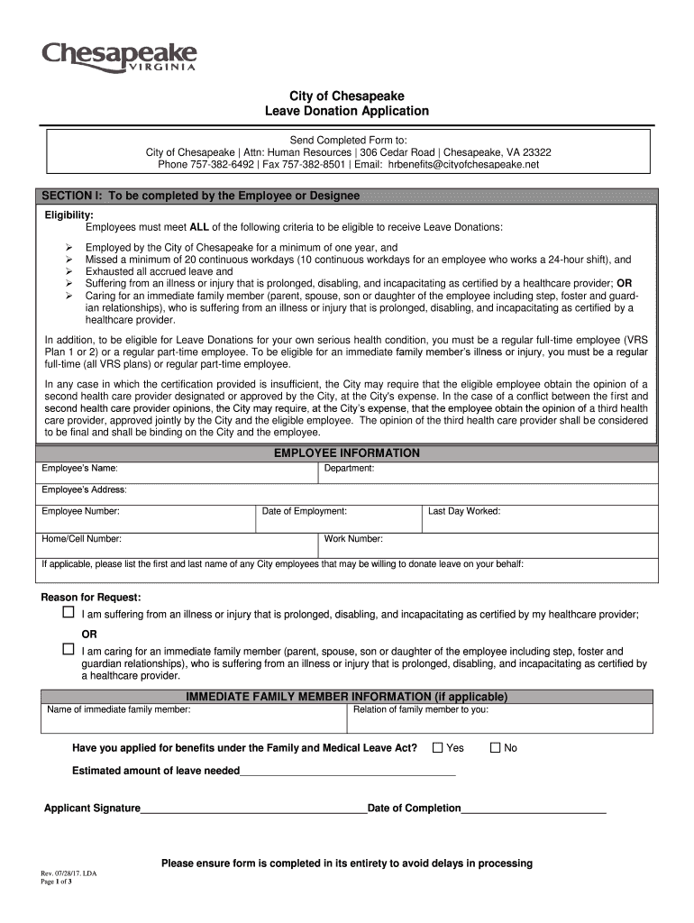 City of Chesapeake Leave Donation Application Send Completed Form to: City of Chesapeake Attn: Human Resources 306 Cedar Road Chesapeake, VA 23322 Phone 7573826492 Fax 7573828501 Email: hr benefits