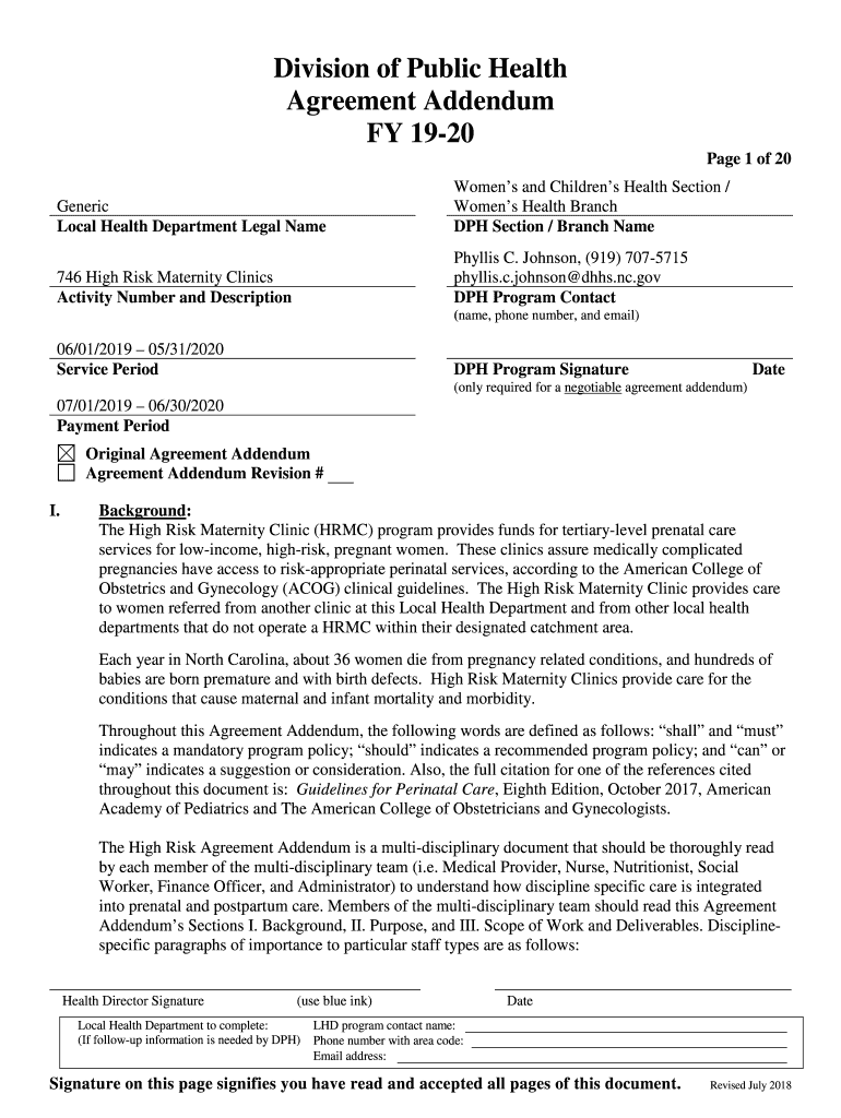 Division of Public Health Agreement Addendum FY 1920-Page 1 of 20 Generic Local Health Department Legal NameWomens and Children's Health Section / Women's Health Branch DPH Section / Branch Name746