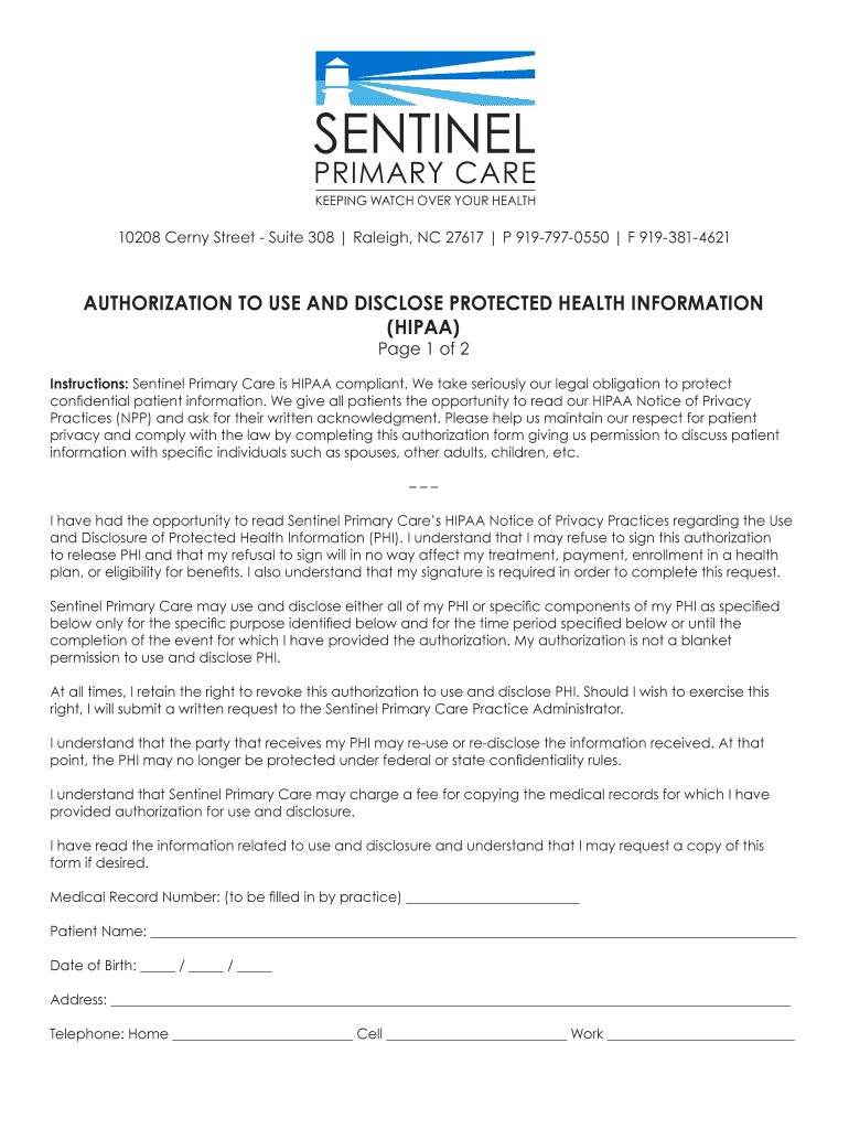 10208 CERN Street Suite 308 Raleigh, NC 27617 P 9197970550 F 9193814621AUTHORIZATION TO USE AND DISCLOSE PROTECTED HEALTH INFORMATION (HIPAA) Page 1 of 2Instructions: Sentinel Primary Care is HIPAA-compliant.