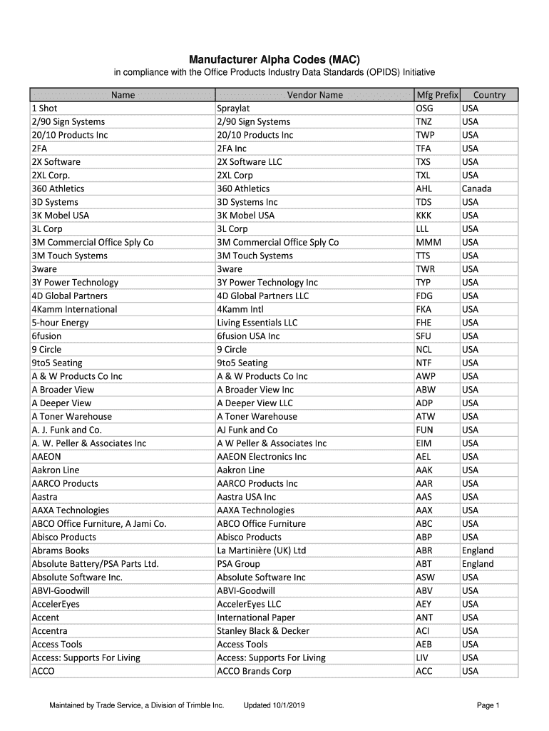 Manufacturer Alpha Codes (MAC) in compliance with the Office Products Industry Data Standards (OP IDS) InitiativeName 1 Shot 2/90 Sign Systems 20/10 Products Inc 2FA 2X Software 2XL Corp. 360 Athletics