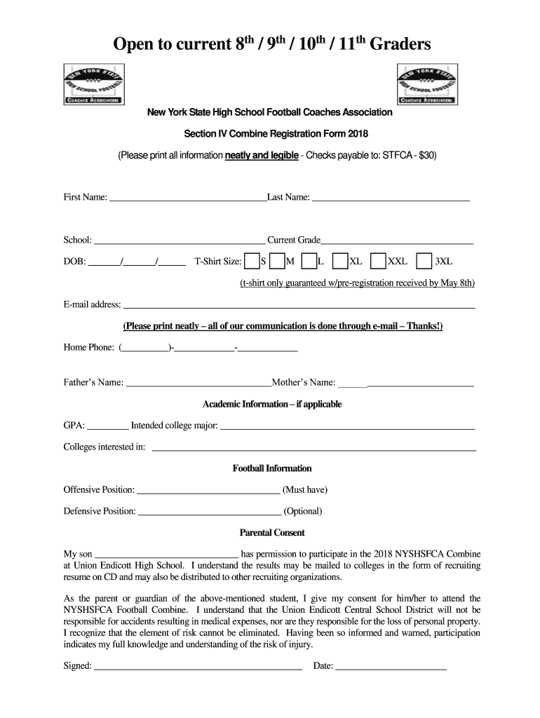 Ga NYSHSFCA Section IV Football Combine Sunday, May 20th 10:00 am Sign In Starts at 11:00amUnion Endicott High School 1200 Main Street Endicott, NY 13760 ×30.00 per Athlete Open to all football players