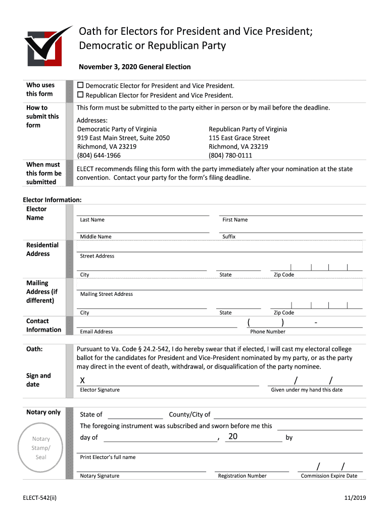 Oath for Electors for President and Vice President; Democratic or Republican Party November 3, 2020, General Election Who uses this form Democratic Elector for President and Vice President. Republican