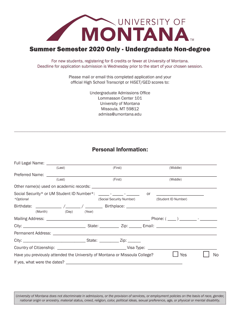 Summer Semester 2020 Only Undergraduate Nondegree For new students, registering for 6 credits or fewer at University of Montana. Deadline for application submission is Wednesday prior to the start