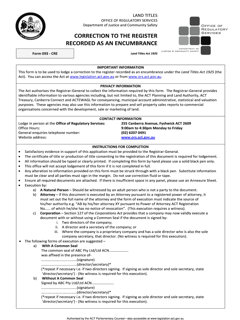 LAND TITLES OFFICE OF REGULATORY SERVICES Department of Justice and Community SafetyCORRECTION TO THE REGISTER RECORDED AS AN ENCUMBRANCE Form 093 Ireland Titles Act 1925IMPORTANT INFORMATION This