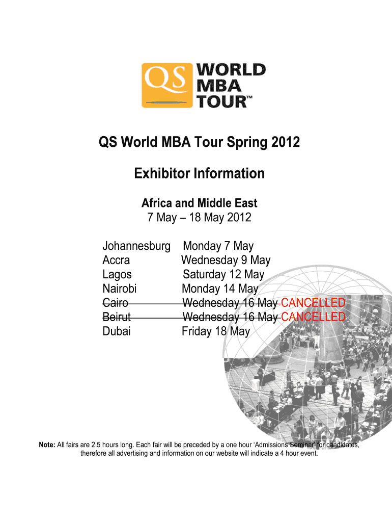 QS World MBA Tour Spring 2012 Exhibitor Information Africa and Middle East 7 May 18 May 2012 Johannesburg Accra Lagos Nairobi Cairo Beirut Dubai Monday 7 May Wednesday 9 May Saturday 12 May Monday