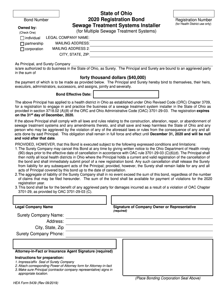 *INSTRUCTIONS* TO BONDING COMPANY FOR EXECUTION OF THE 2020 SEWAGE TREATMENT SYSTEM INSTALLER, SERVICE PROVIDER, AND SEPTA GE HAULER REGISTRATION BOND General Information All sewage treatment system