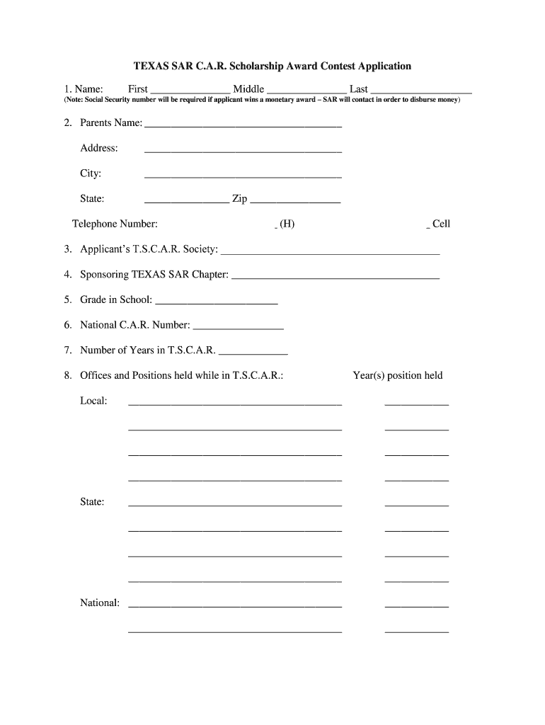 TEXAS SOCIETY SONS OF THE AMERICAN REVOLUTION (TEXAS SAR) CHILDREN OF THE AMERICAN REVOLUTION (C.A.R.) SCHOLARSHIP CONTEST 2019/2020 Deadline for application to local SAR Chapter December 31st, 2019