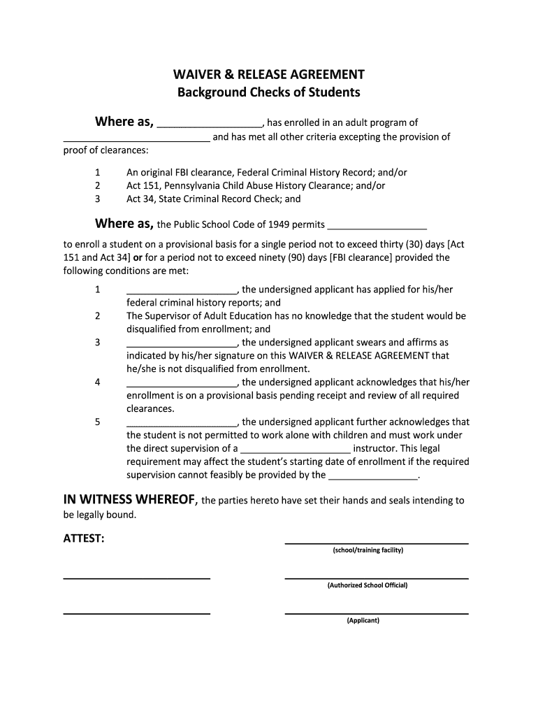 WAIVER & RELEASE AGREEMENT Background Checks of Students Whereas, has enrolled in an adult program of and has met all other criteria excepting the provision of proof of clearances: 1 2 3An original