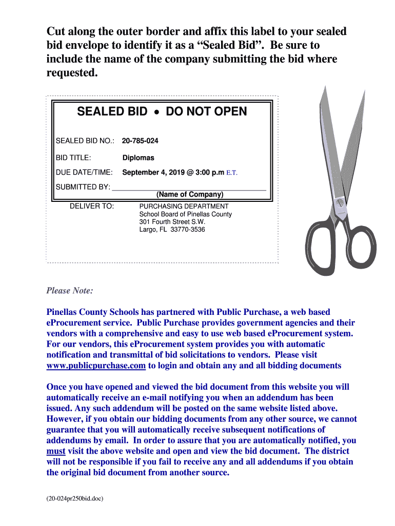 Cut along the outer border and affix this label to your sealed bid envelope to identify it as a Sealed Bid. Be sure to include the name of the company submitting the bid where requested. SEALED BID