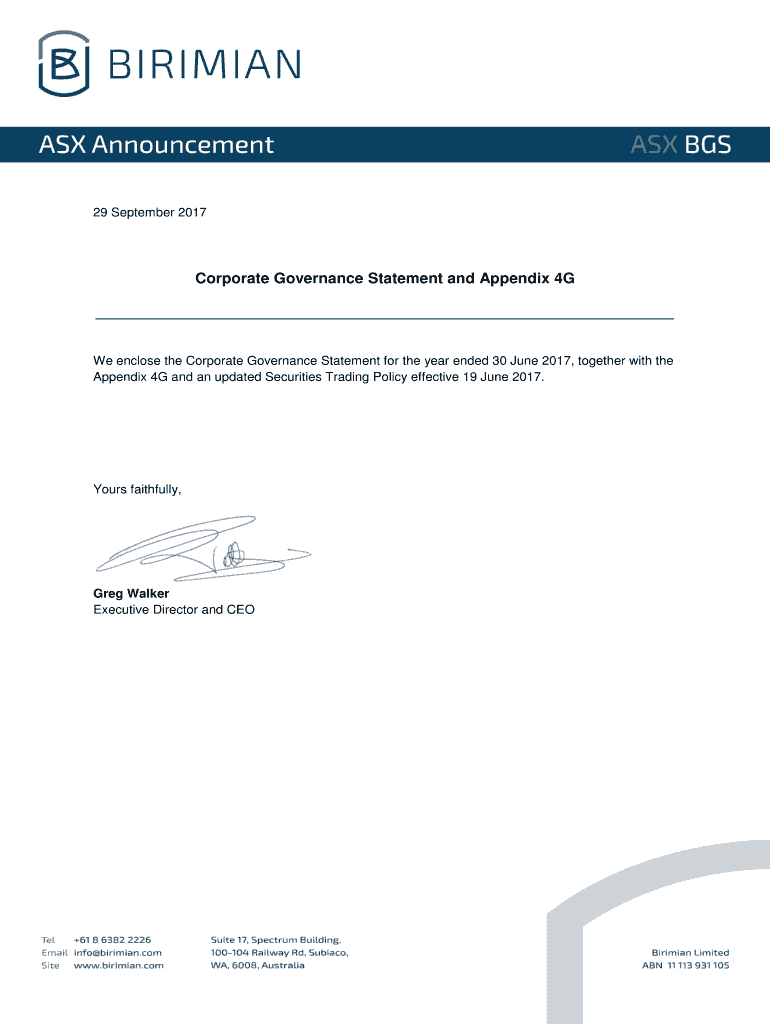 29 September 2017Corporate Governance Statement and Appendix 4G We enclose the Corporate Governance Statement for the year ended 30 June 2017, together with the Appendix 4G and an updated Securities