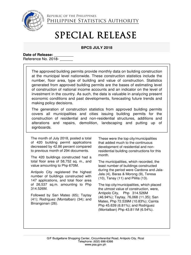 Republic of the Philippines Philippine Statistics AuthoritySPECIAL RELEASE PCs JULY 2018 Date of Release: Reference No. 2018 The approved building permits provide monthly data on building construction
