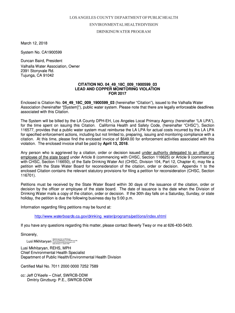 LOS ANGELES COUNTY DEPARTMENT OF PUBLIC HEALTH ENVIRONMENTAL HEALTH DIVISION DRINKING WATER PROGRAM March 12, 2018, System No. CA1900599 Duncan Baird, President Valhalla Water Association, Owner 2391
