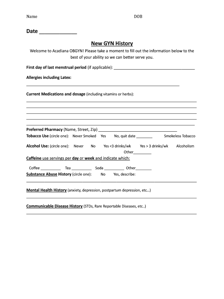 NameDOBDate New GUN History Welcome to Acadian ORGAN! Please take a moment to fill out the information below to the best of your ability, so we can better serve you. First day of last menstrual period