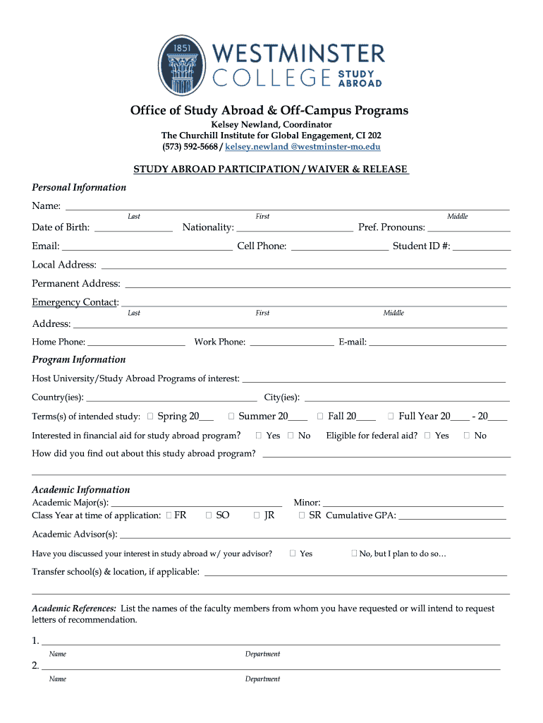 Get the free Office of Study Abroad & Off-Campus Programs - Westminster ...