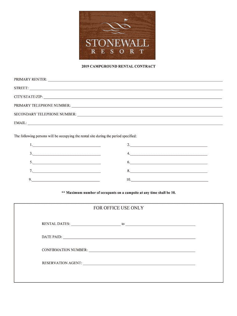 2019 CAMPGROUND RENTAL CONTRACT PRIMARY RENTER: STREET: CITY/STATE/ZIP: PRIMARY TELEPHONE NUMBER: SECONDARY TELEPHONE NUMBER: EMAIL: The following persons will be occupying the rental site during