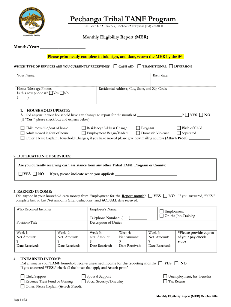 Change Tribal TANK Program P.O. Box 1477 Temecula, CA 92593 Telephone (951) 7706000Monthly Eligibility Report (MER) Month/Year: Please print neatly complete in ink, sign, and date, return the MER