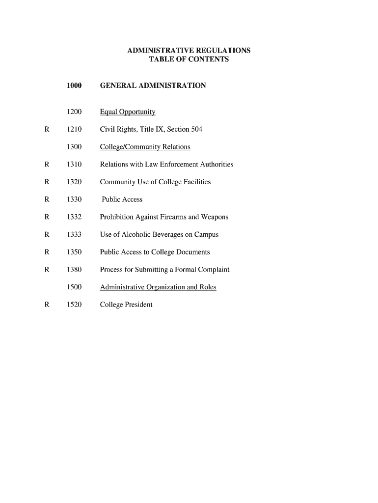 TABLE OF CONTENTS1000GENERAL ADMINISTRATION1200Equal Opportunity1210Civil Rights, Title IX, Section 5041300College/Community RelationsR1310Relations with Law Enforcement