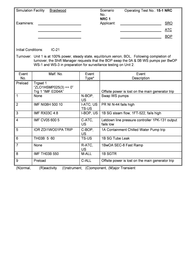 Simulation Facility Examiners:BraidwoodScenario No.: NRC 1 Applicant: Operating Test No.: 151 NRC SRO ATC Initial Conditions:IC21Turnover: Unit 1 is at 100% power, steady state, equilibrium xenon,