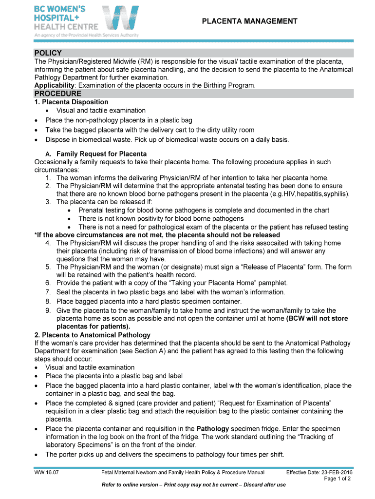 PLACENTA MANAGEMENTPOLICYThe Physician/Registered Midwife (RM) is responsible for the visual/ tactile examination of the placenta, informing the patient about safe placenta handling, and the decision