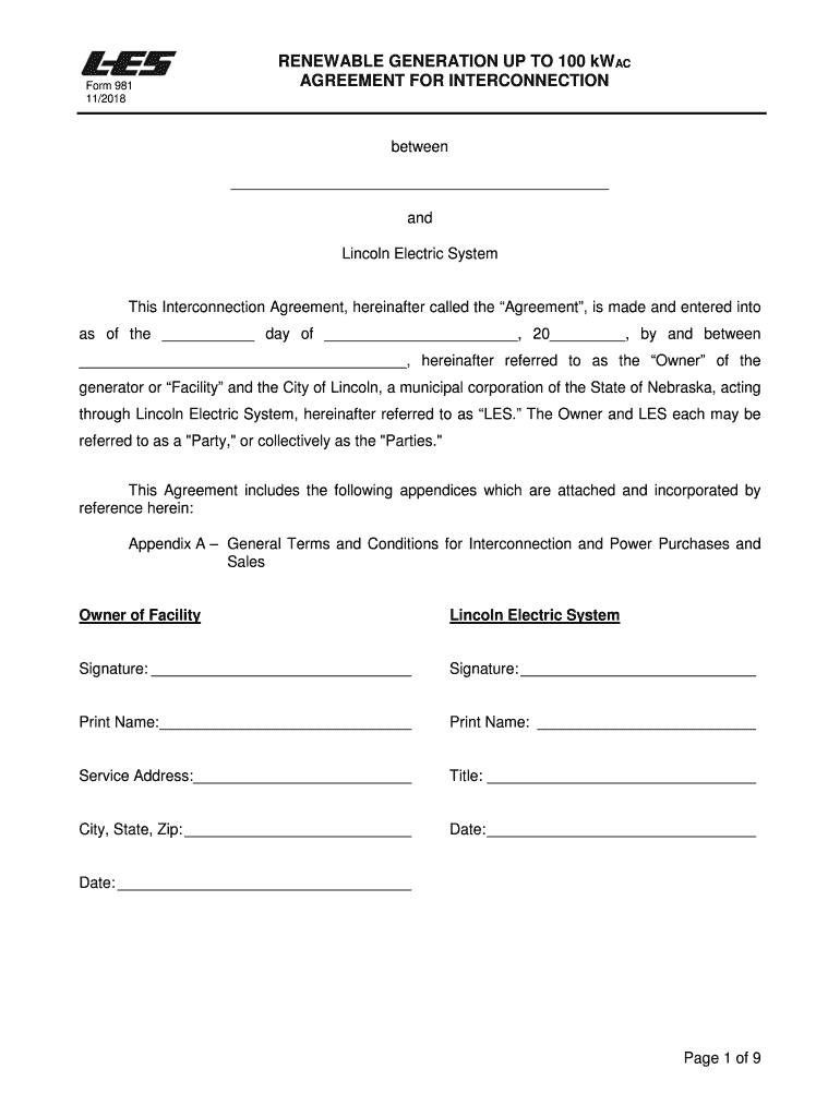 Form 981 11/2018RENEWABLE GENERATION UP TO 100 WAC AGREEMENT FOR INTERCONNECTION between and Lincoln Electric Systems Interconnection Agreement, hereinafter called the Agreement, is made and entered