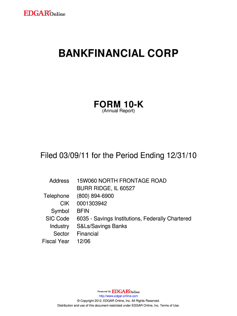 Get the free BANKFINANCIAL CORP. FORM 10-K (Annual Report) Filed 03/09/11 for the Period Ending 1...
