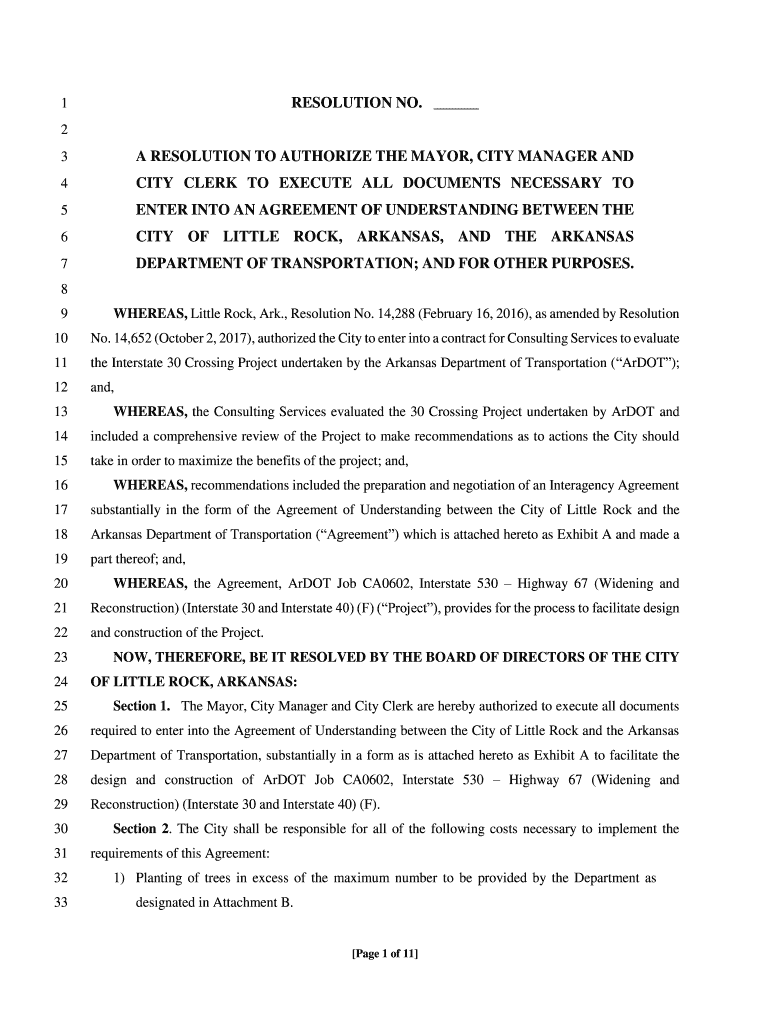 RESOLUTION NO. 1 2 3A RESOLUTION TO AUTHORIZE THE MAYOR, CITY MANAGER AND4CITY CLERK TO EXECUTE ALL DOCUMENTS NECESSARY TO5ENTER INTO AN AGREEMENT OF UNDERSTANDING BETWEEN THE6CITY OF LITTLE ROCK,
