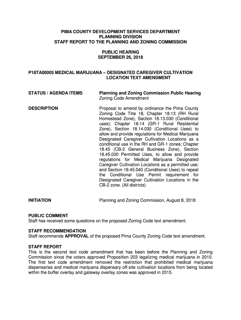PIMA COUNTY DEVELOPMENT SERVICES DEPARTMENT PLANNING DIVISION STAFF REPORT TO THE PLANNING AND ZONING COMMISSION PUBLIC HEARING SEPTEMBER 26, 2018P18TA00005 MEDICAL MARIJUANA DESIGNATED CAREGIVER