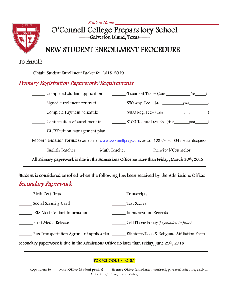 Student Name O'Connell College Preparatory School Galveston Island, Texas STUDENT ENROLLMENT PROCEDURE To Enroll: Obtain Student Enrollment Packet for 20182019Primary Registration Paperwork/Requirements