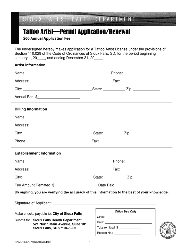Tattoo ArtistPermit Application/Renewal The undersigned hereby makes application for a Tattoo Artist License under the provisions of Section 110.029 of the Code of Ordinances of Sioux Falls, SD, for