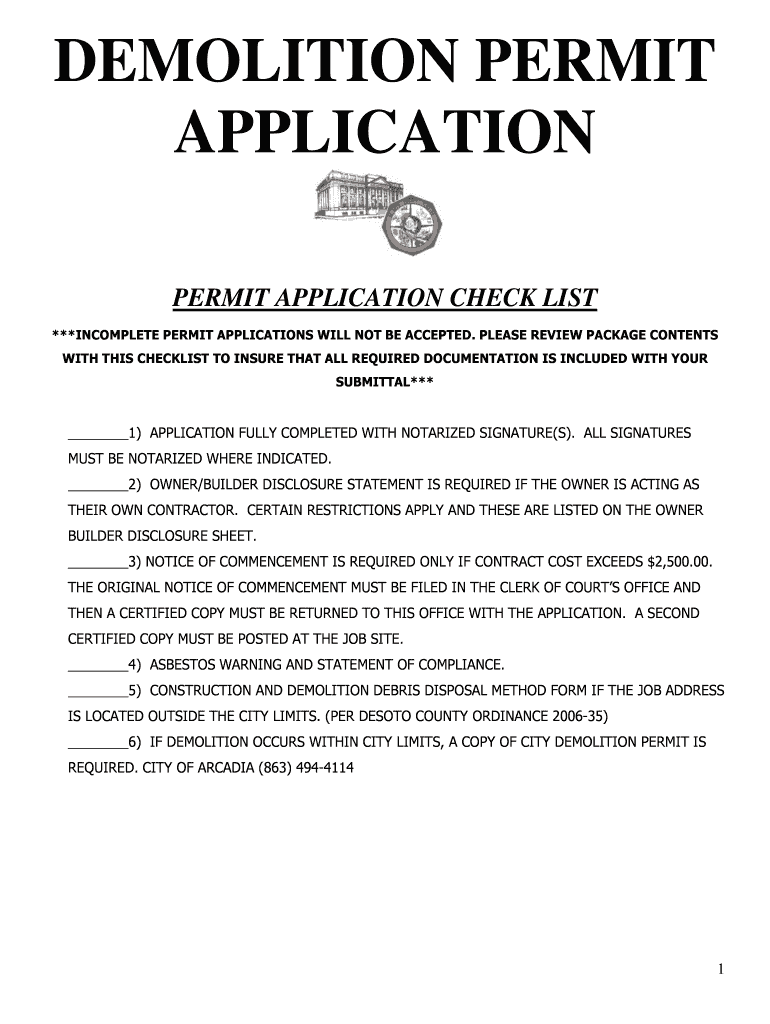 DEMOLITION PERMIT APPLICATION CHECK LIST ***INCOMPLETE PERMIT APPLICATIONS WILL NOT BE ACCEPTED. PLEASE REVIEW PACKAGE CONTENTS WITH THIS CHECKLIST TO Ensure THAT ALL REQUIRED DOCUMENTATION IS INCLUDED