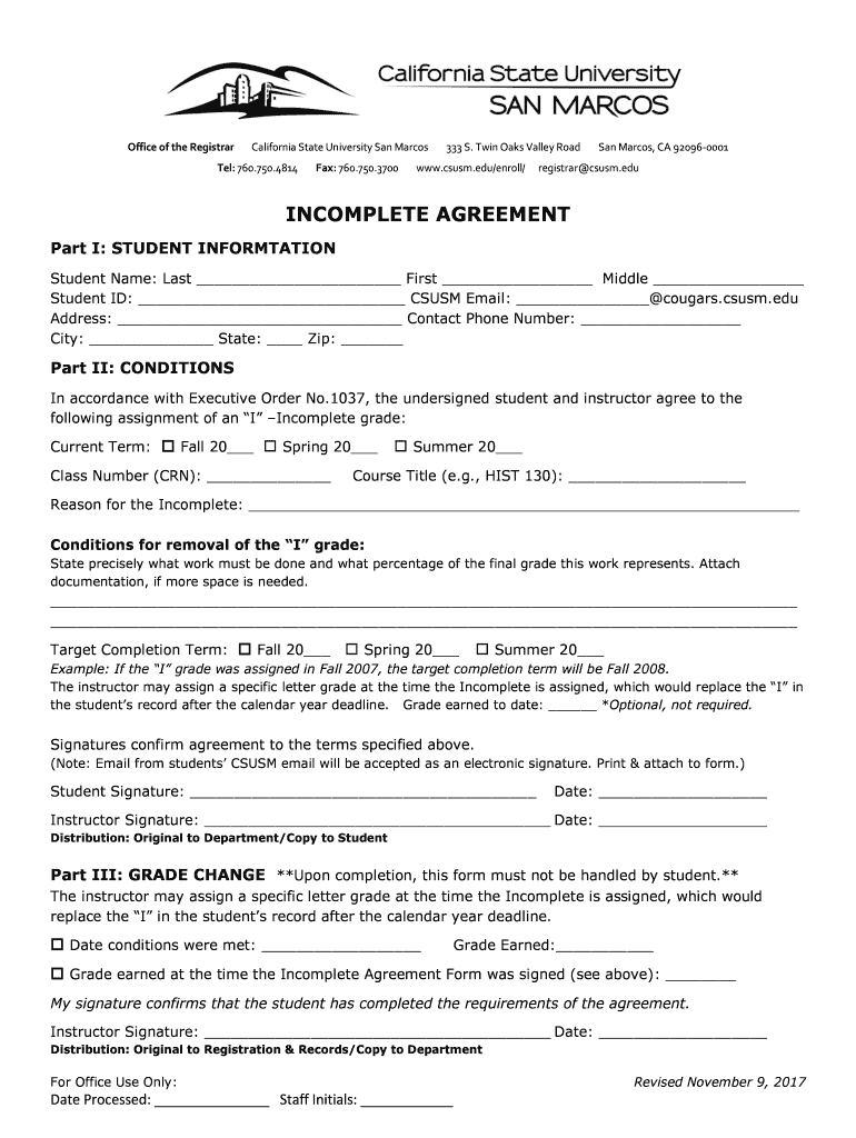 Office of the Registrar California State University San Marcel: 760.750.4814Fax: 760.750.3700333 S. Twin Oaks Valley Roadwww.csusm.edu/enroll/San Marcos, CA 920960001registrar cause. Incomplete AGREEMENT