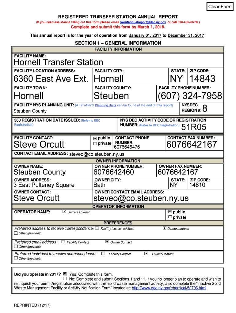 Clear Form REGISTERED TRANSFER STATION ANNUAL REPORT (If you need assistance filling out this form please email swmfannualreport DEC.NY.gov or call 5184028678.) Complete and submit this form by March