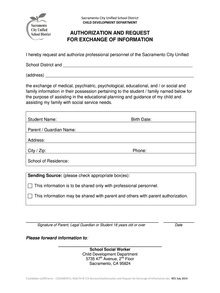 Sacramento City Unified School District CHILD DEVELOPMENT DEPARTMENTAUTHORIZATION AND REQUEST FOR EXCHANGE OF INFORMATION I hereby request and authorize professional personnel of the Sacramento City
