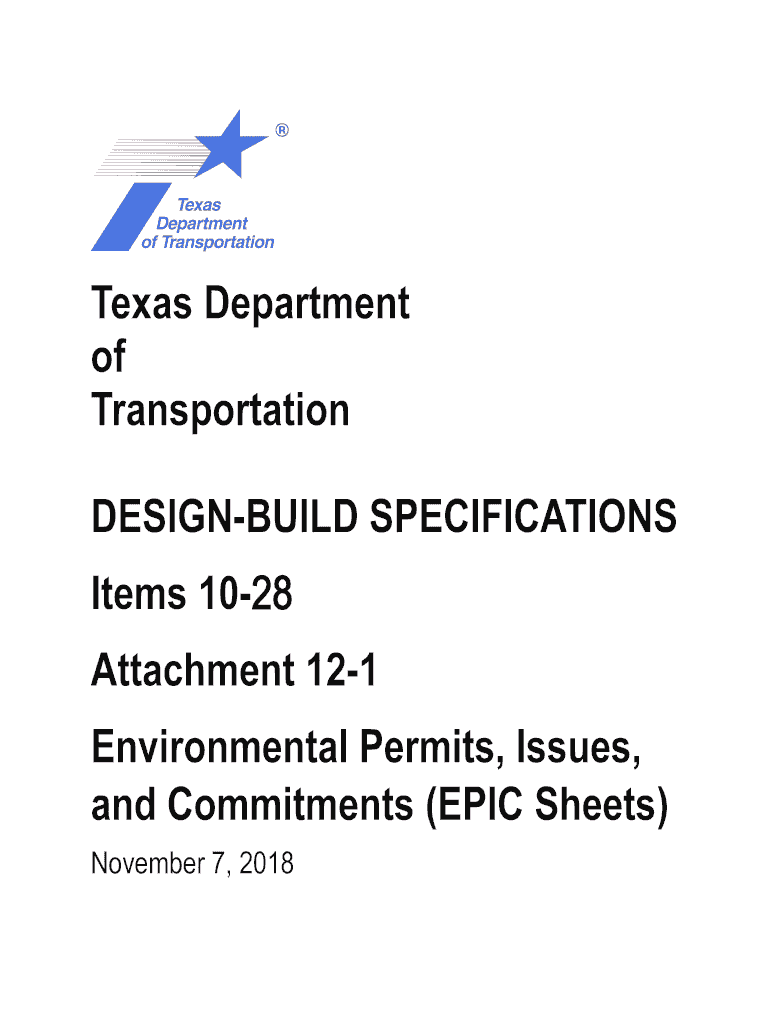Texas Department of Transportation DESIGNBUILD SPECIFICATIONS Items 1028 Attachment 121 Environmental Permits, Issues, and Commitments (EPIC Sheets) November 7, 2018During the planning phase of project