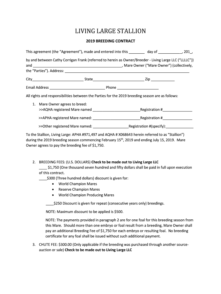 LIVING LARGE STALLION 2019 BREEDING CONTRACT This agreement (the Agreement), made and entered into this day of, 201, by and between Cathy Mórrígan Frank (referred to herein as Owner/Breeder Living