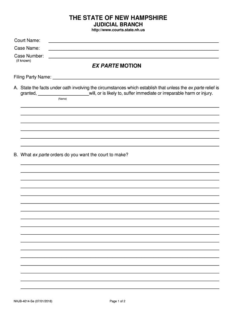 Clear Forth STATE OF NEW HAMPSHIRELock & Save Prejudicial BRANCH http://www.courts.state.nh.usCourt Name: Case Name: Case Number: (if known)EX PARTE MOTION Filing Party Name: A. State the facts under