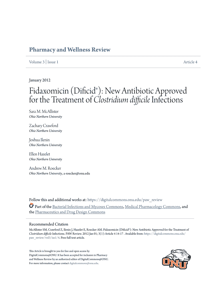 Pharmacy and Wellness Review Volume 3 Issue 1Article 4January 2012Fidaxomicin (): New Antibiotic Approved for the Treatment of Clostridium difficile Infections Sara M. McAllister Ohio Northern University