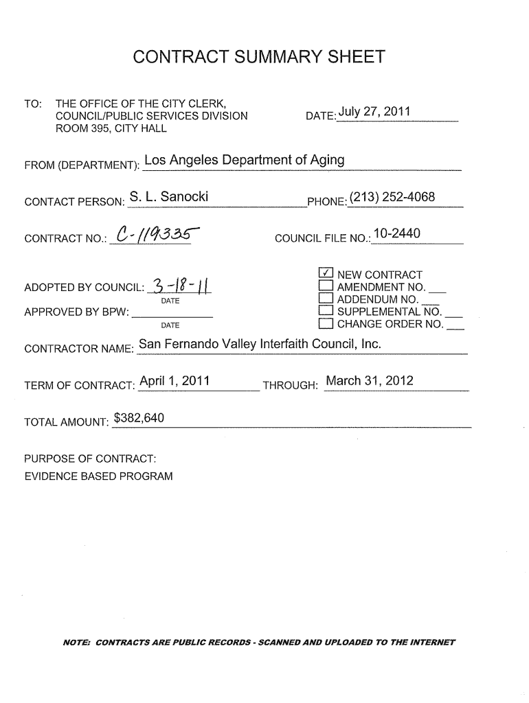 CONTRACT SUMMARY SHEET TO:THE OFFICE OF THE CITY CLERK, COUNCIL/PUBLIC SERVICES DIVISION ROOM 395, CITY HALLCONTRACT NO.’ S. L. Sanofi(/lq3ADOPTED BY COUNCIL:PHONE’D AMENDMENT NO. D ADDENDUM NO.