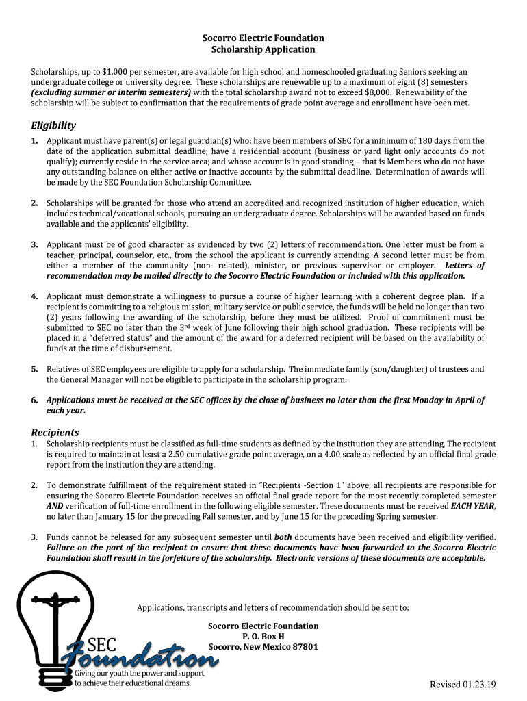 Scholarships, up to $1,000 per semester, are available for high school and homeschooled graduating Seniors seeking an