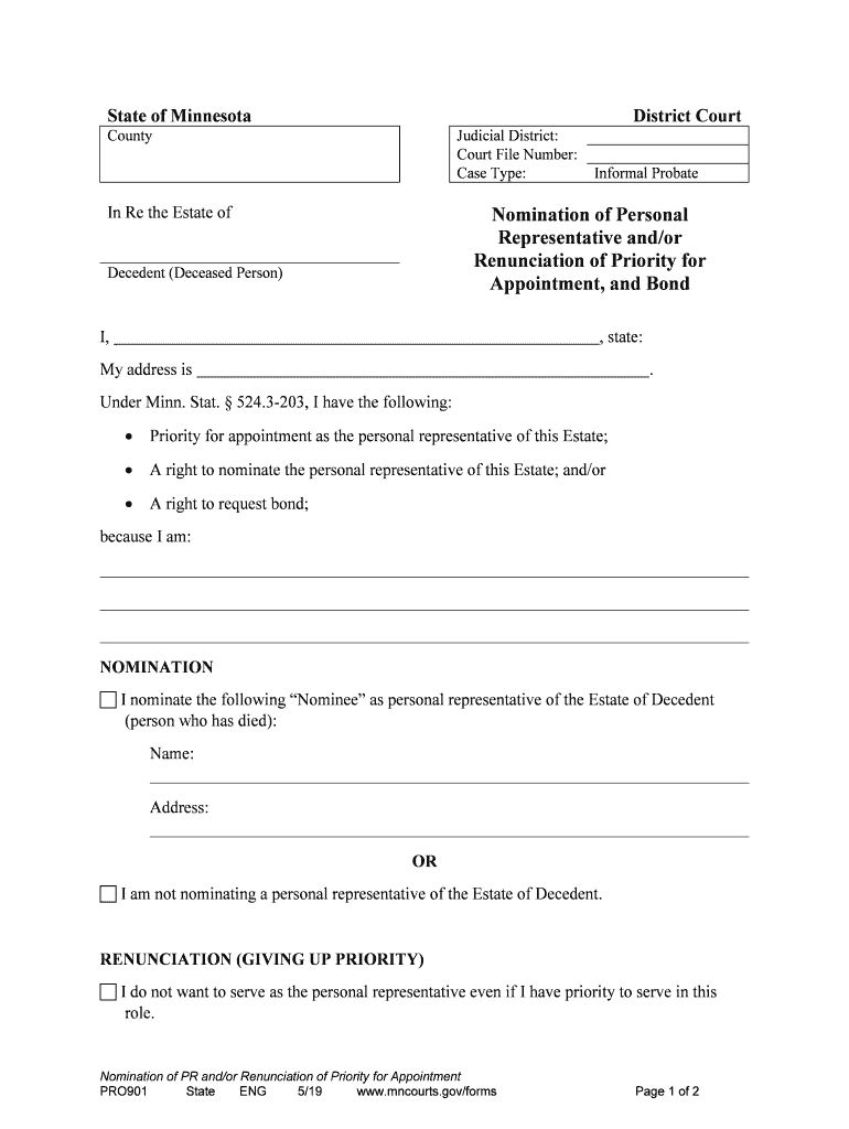 State of MinnesotaDistrict CourtCountyJudicial District: Court File Number: Case Type:In Re the Estate informal ProbateNomination of Personal Representative and/or Renunciation of Priority for Appointment,