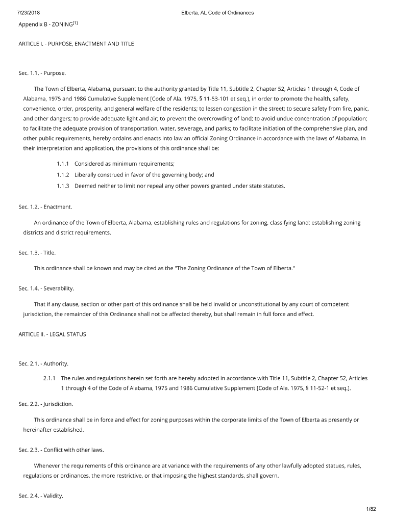 7/23/2018Elberta, AL Code of OrdinancesAppendix B ZONING 1 ARTICLE I. PURPOSE, ENACTMENT AND TITLE Sec. 1.1. Purpose. The Town of Alberta, Alabama, pursuant to the authority granted by Title 11, Subtitle