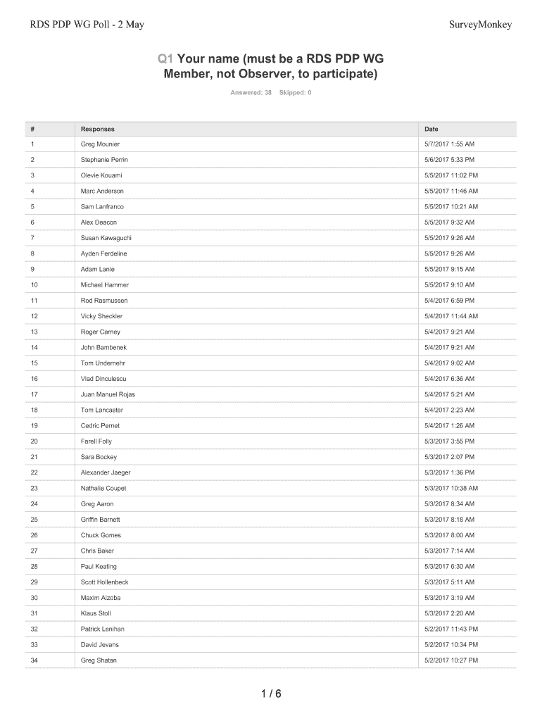 RDS PDP WE Poll 2 MaySurveyMonkeyQ1 Your name (must be an RDS PDP WE Member, not Observer, to participate) Answered: 38Skipped: 0×ResponsesDate1Greg Mounier5/7/2017 1:55 AM2Stephanie Perrin5/6/2017