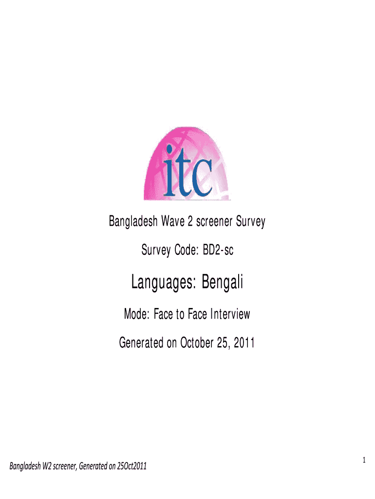 Bangladesh Wave 2 screener Survey Code: BD2scLanguages: Bengali Mode: Face to Face Interview Generated on October 25, 2011BangladeshW2screener,Generatedon25Oct2011 1Bangladesh W2 screener Q# VarNameBD2sc001