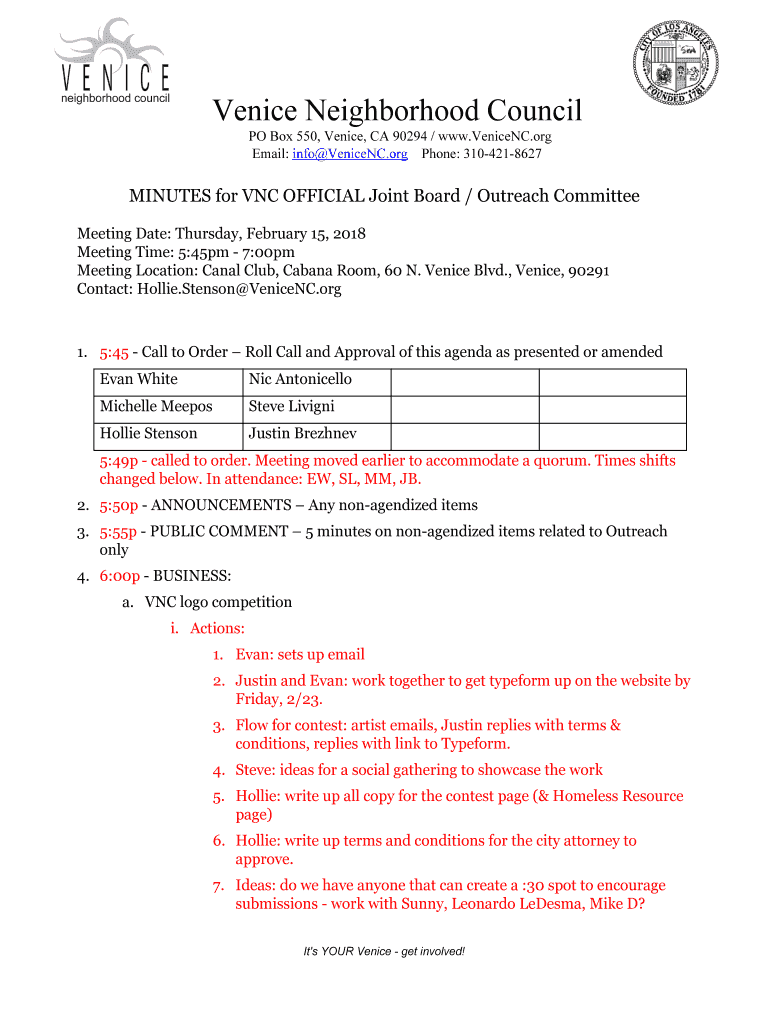 Venice Neighborhood Council PO Box 550, Venice, CA 90294 / www.VeniceNC.org Email: info Venice NC.org Phone: 3104218627MINUTES for VNC OFFICIAL Joint Board / Outreach Committee Meeting Date: Thursday,