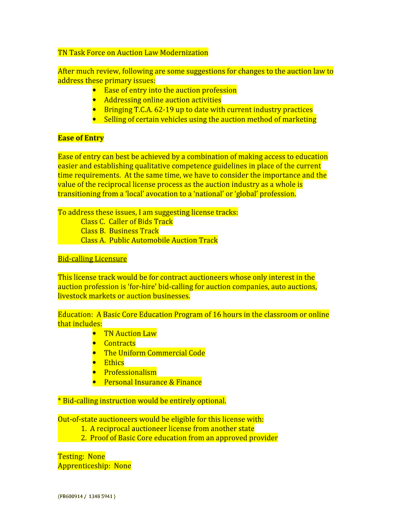 TN Task Force on Auction Law Modernization After much review, following are some suggestions for changes to the auction law to address these primary issues: Ease of entry into the auction profession