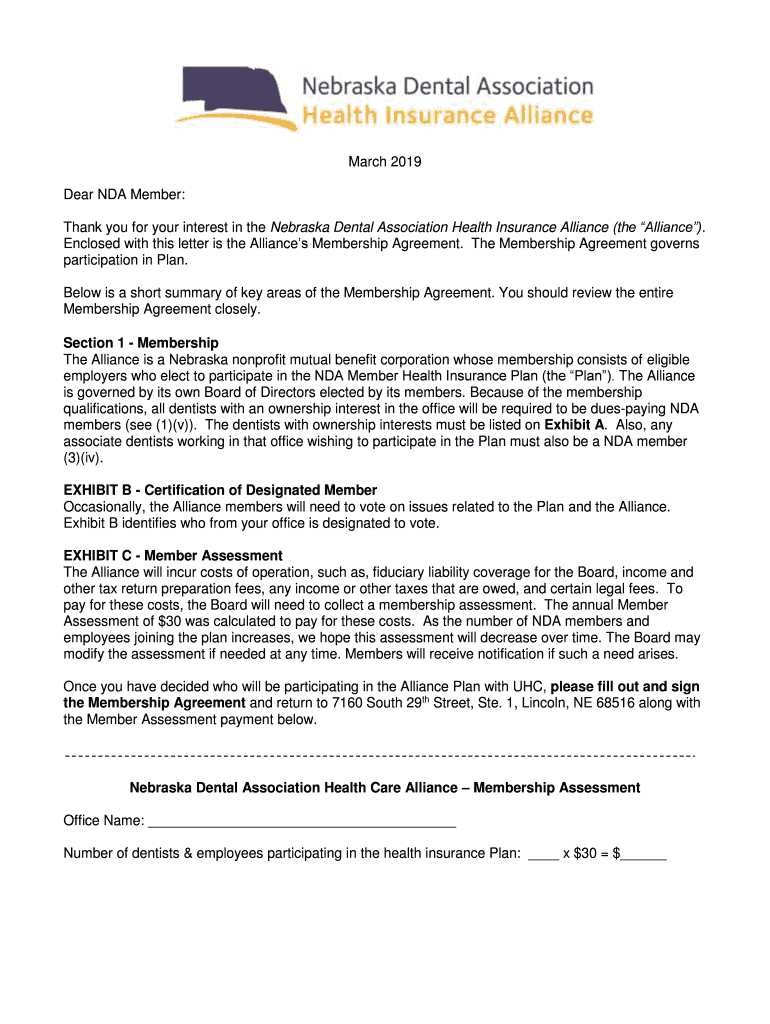 March 2019 Dear NDA Member: Thank you for your interest in the Nebraska Dental Association Health Insurance Alliance (the Alliance). Enclosed with this letter is the Alliances Membership Agreement.
