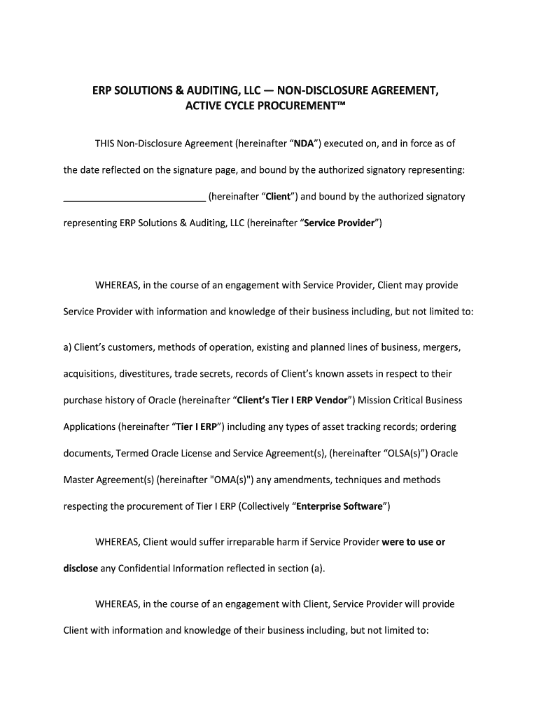 ERP SOLUTIONS & AUDITING, LLC NONDISCLOSURE AGREEMENT, ACTIVE CYCLE PROCUREMENT THIS Nondisclosure Agreement (hereinafter NDA) executed on, and in force as of the date reflected on the signature page,