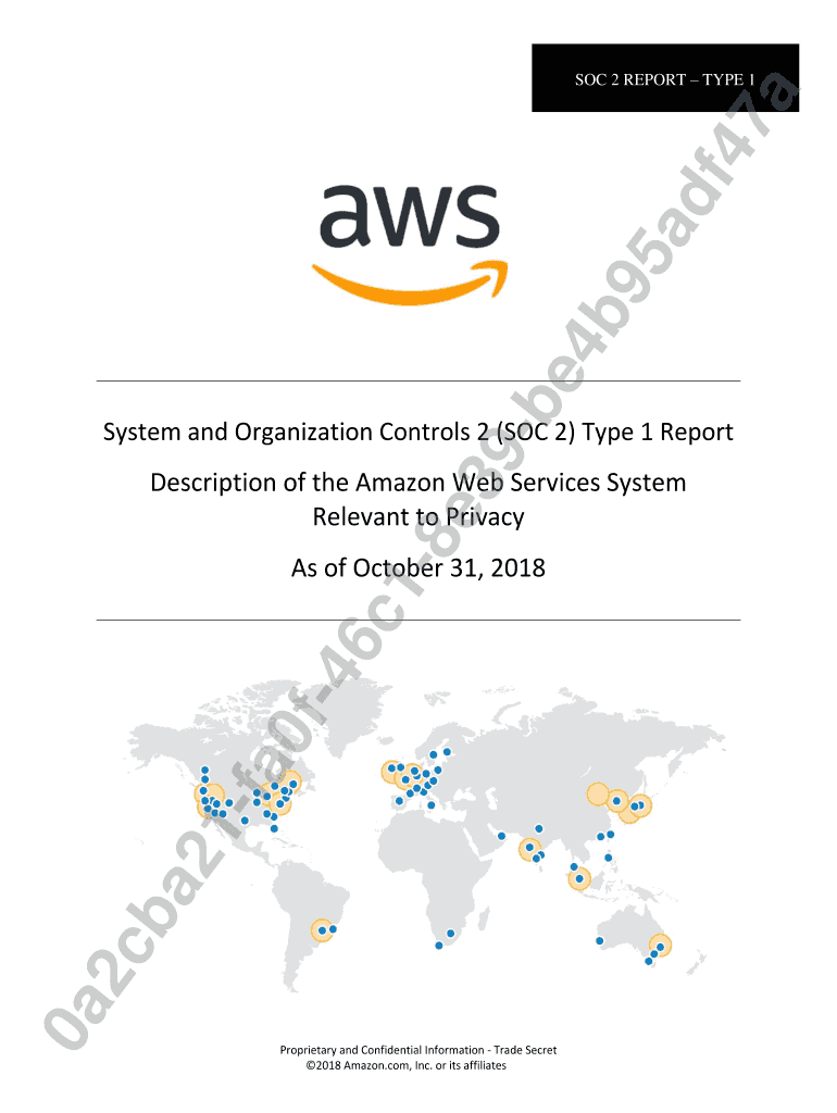 Be4b9 5ad f47aSOC 2 REPORT TYPE 139System and Organization Controls 2 (SOC 2) Type 1 Report8eDescription of the Amazon Web Services System Relevant to Privacy0a2cba21fa 0f 46c1As of October 31, 2018Proprietary