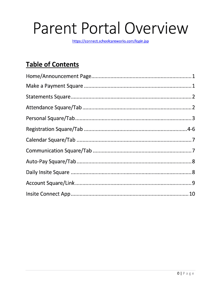 Parent Portal Overview https://connect.schoolcareworks.com/login.jspTable of Contents Home/Announcement Page.................................................................... 1 Make a Payment Square