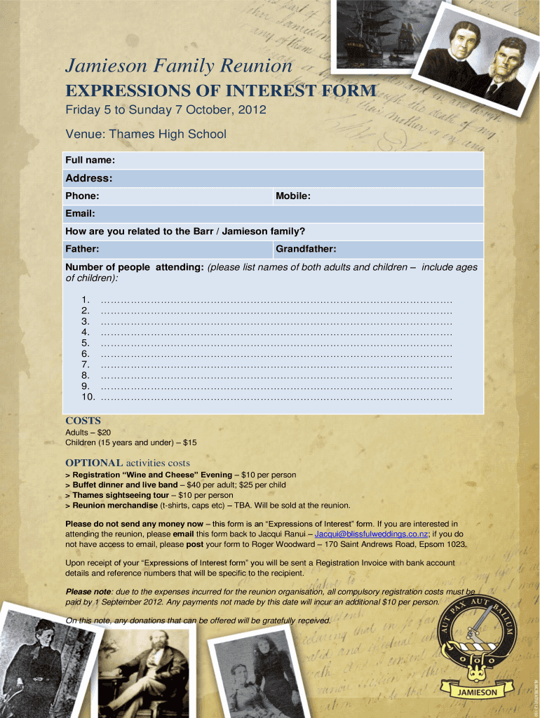 Jamieson Family Reunion EXPRESSIONS OF INTEREST FORM Friday 5 to Sunday 7 October 2012 Venue: Thames High School Full name:Address: Phone:Mobile:Email: How are you related to the Barr / Jamieson family?